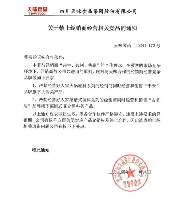 近日,網(wǎng)傳消息顯示,天味食品向經(jīng)銷商下發(fā)通知稱,嚴禁經(jīng)營本公司火鍋底料系列的經(jīng)銷商同時經(jīng)營和銷售“千禾”品牌旗下火鍋類產(chǎn)品;嚴禁經(jīng)營本公司菜譜式調(diào)料系列的經(jīng)銷商同時經(jīng)營和銷售“吉香居”品牌旗下菜譜式復合調(diào)料類產(chǎn)品。