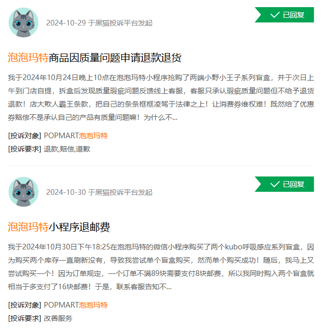 時至今日,在黑貓投訴平臺以“泡泡瑪特”為關(guān)鍵詞進(jìn)行搜索可以看到超過16000條投訴,大多集中在質(zhì)量問題、退貨難以及和客服之間溝通矛盾等問題。