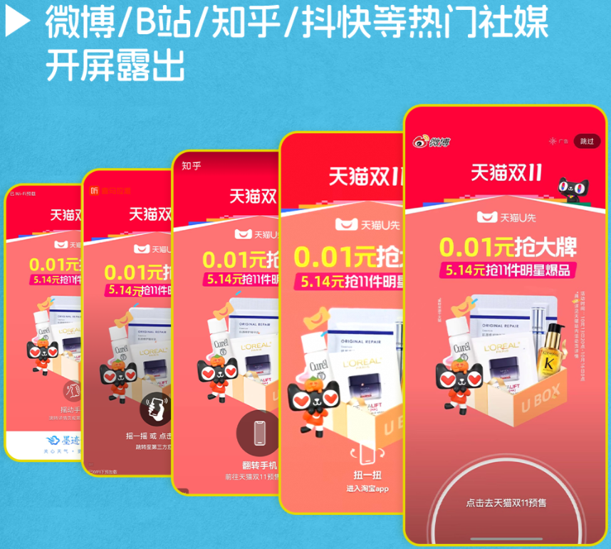 鑒于消費(fèi)者對(duì)主題盒的喜愛(ài),大促期間,各類站內(nèi)外營(yíng)銷以及平臺(tái)補(bǔ)貼集中投放到瘋狂試用日的主題活動(dòng)中來(lái),如微博、B站、知乎、抖快等多個(gè)熱門社媒的開(kāi)屏露出、20多個(gè)重點(diǎn)城市的線下硬廣曝光等,成功助力品牌在雙11期間蓄水爆發(fā)。