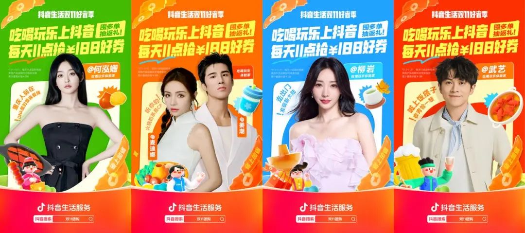 于是,在這個雙11的中期,抖音生活服務(wù)邀請到了何泓姍、姜潮&麥迪娜、柳巖、武藝、穎兒、鐘麗緹等明星大咖,通過vlog的形式分享他們的吃喝玩樂日常,為用戶種下了“吃喝玩樂上抖音”的心智;