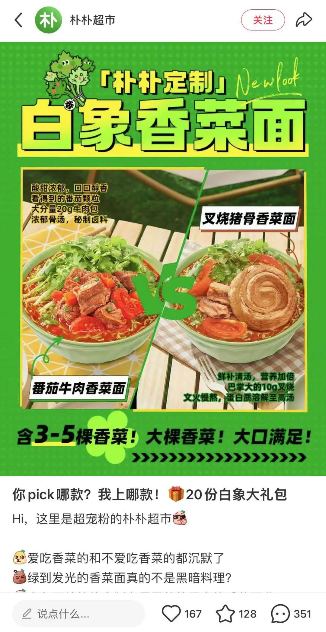 白象更是為香菜面定制了各種渠道限定版,與樸樸超市合作推出番茄牛肉定制款香菜面,與盒馬超市聯(lián)合打造渠道定制款香菜面,用白象的面餅、調味包搭配盒馬供應鏈中真正的香菜,逐步打開全渠道市場。