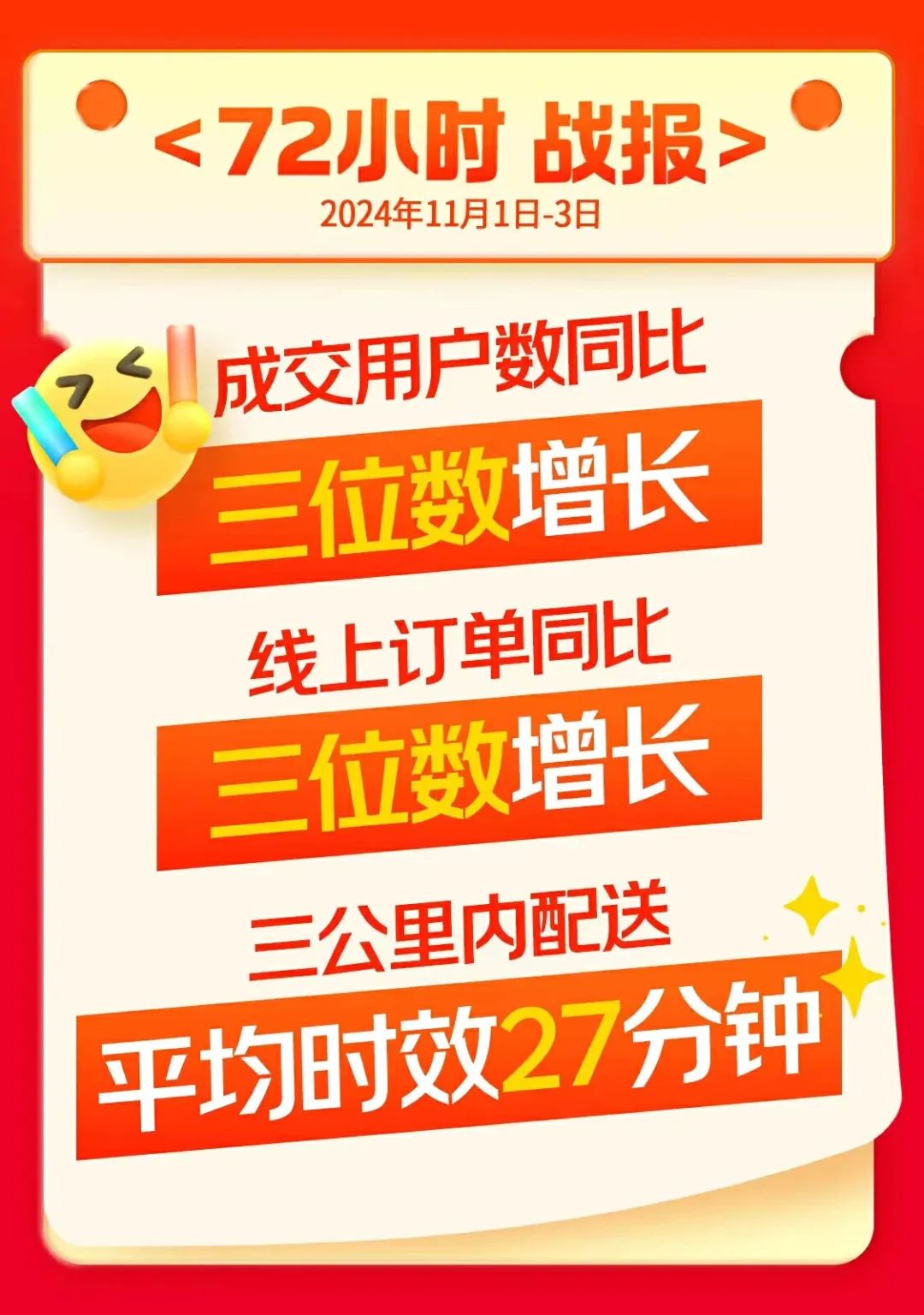 同一時間,京東發(fā)布“擊穿價,真便宜不用比“活動,僅僅3天,成交用戶數(shù)、線上訂單數(shù)同比增長均破三位數(shù),在這種情況下,三公里配送平均時效僅為27分鐘,前置倉的優(yōu)勢展現(xiàn)的淋漓盡致。