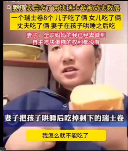 日前,一段關(guān)于“一盒8個瑞士卷,我能吃幾個?”的視頻沖上網(wǎng)絡(luò)熱搜,事情的起因是一位媽媽買了8個瑞士卷),她的女兒、兒子和老公各吃兩個,自己在家務(wù)結(jié)束后,想把剩下的兩個瑞士卷吃了,卻遭到老公的指責(zé),引發(fā)兩人的爭吵。