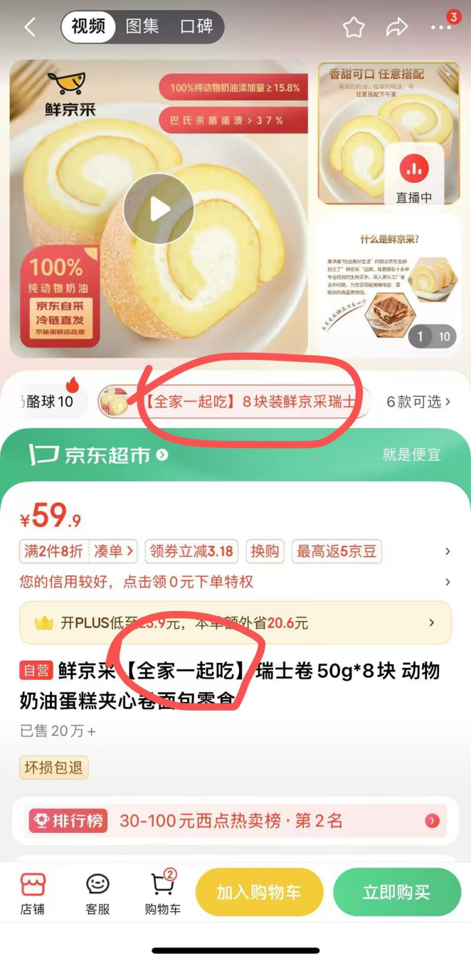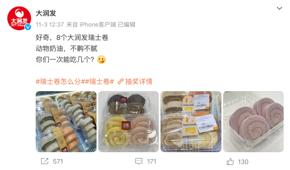 京東七鮮則在社交平臺表示“都別問了,管夠”,并進(jìn)行瑞士卷抽獎活動;京東旗下專注于烘焙食品的品牌鮮京采也在瑞士卷詳情頁寫出“全家一起吃”的宣傳語。此外,大潤發(fā)、麥德龍等多家商超也加入其中,試圖接住這波突如其來的流量,開展各類營銷。