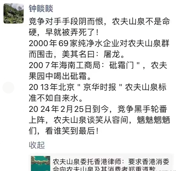 當時網上流傳的一張截圖顯示,疑似鐘睒睒在朋友圈發(fā)文吐槽:“競爭對手手段陰而狠,農夫山泉不是命硬,早就被弄死了!”,他歷數此前“屠龍”、“砒霜門”等事件,并將此番遭遇歸結為“競爭黑手輪番上陣”。