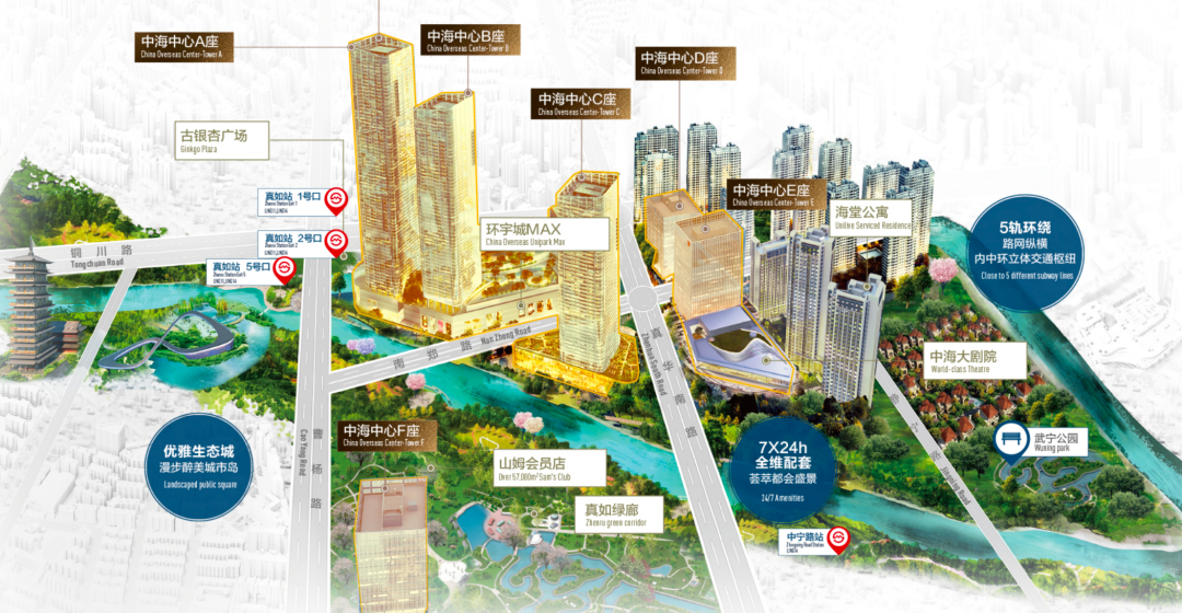 真如環(huán)宇城MAX、山姆會員商店,以及總建筑面積達(dá)30萬方的商務(wù)寫字樓群——中海中心、包含1600套住宅的中海臻如府、可容納470多戶租戶的長租公寓——海堂公寓、1000座多功能劇院——海心劇院,還有約2萬方的公共綠地廣場——濱水的銀杏廣場、海納公園……