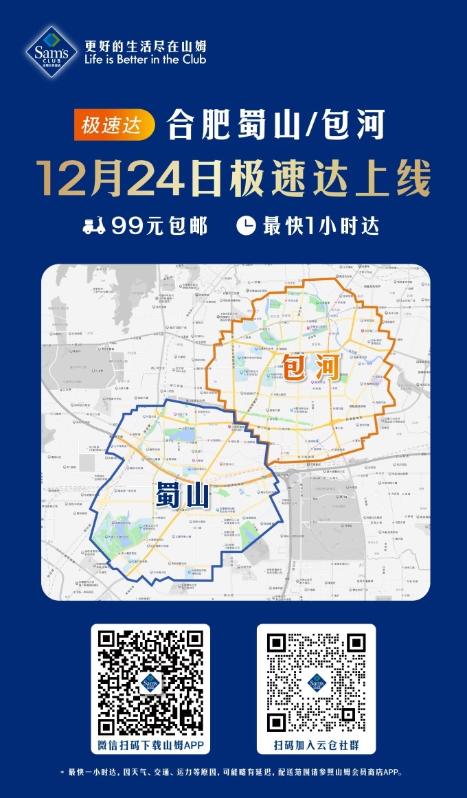 12月24日起,合肥山姆會員商店“極速達”服務(wù)將覆蓋包河區(qū)和蜀山區(qū),會員僅需通過山姆APP下單,即可享受最快一小時“極速達”配送到家服務(wù),滿99元即可享受包郵服務(wù)。緊接著,瑤海區(qū)和廬陽區(qū)也將納入“極速達”服務(wù)覆蓋范圍。