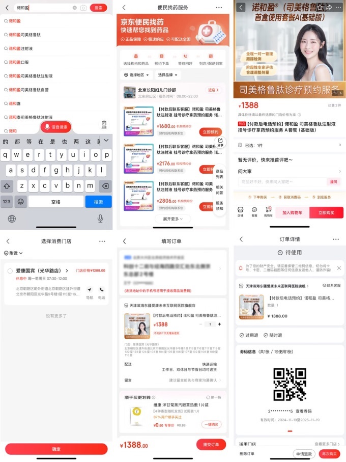 使用京東APP搜索“諾和盈”,進入到“便民找藥頁面”。在這個頁面中,會顯示所在城市能夠提供服務(wù)的線下機構(gòu)。選擇距離自己最近的一家醫(yī)療機構(gòu),預(yù)約了價格為1388元的A套餐(基礎(chǔ)版)。付款成功后,手機上生成了一個“待使用”的核銷碼,憑這個核銷碼,就可以前往預(yù)約的線下醫(yī)療機構(gòu),完成掛號問診后進行取藥注射等服務(wù)。