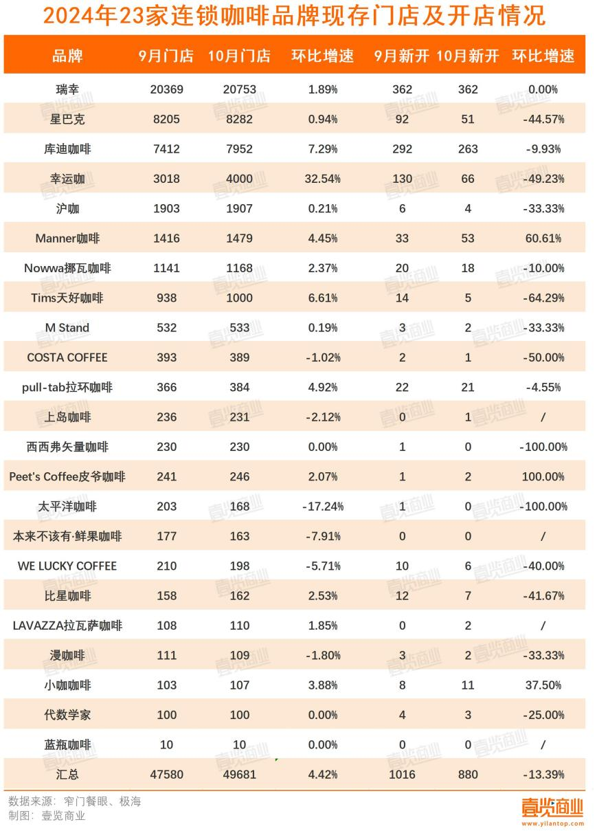 從現(xiàn)存門店數(shù)量看,瑞幸以20753家門店穩(wěn)居第一,擁有8282家門店的星巴克緊隨其后,隨后是7952家的庫(kù)迪咖啡。此外,就在10月,幸運(yùn)咖門店數(shù)量突破4000家、Tims天好咖啡門店數(shù)量突破1000家。