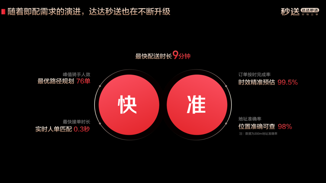 基于即配需求的不斷演進(jìn),達(dá)達(dá)秒送的即配服務(wù)也在不斷升級(jí),在最快配送時(shí)長(zhǎng)9分鐘基礎(chǔ)上進(jìn)一步提升精準(zhǔn)度,包括時(shí)效精準(zhǔn)預(yù)估,訂單按時(shí)完成率高達(dá)99.5%;地址準(zhǔn)確率高達(dá)98%;實(shí)時(shí)人單匹配快至0.3秒,真正做到“毫秒級(jí)接單”。