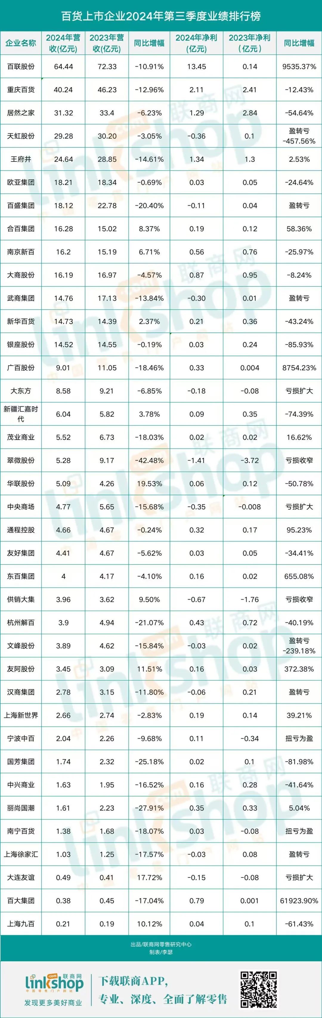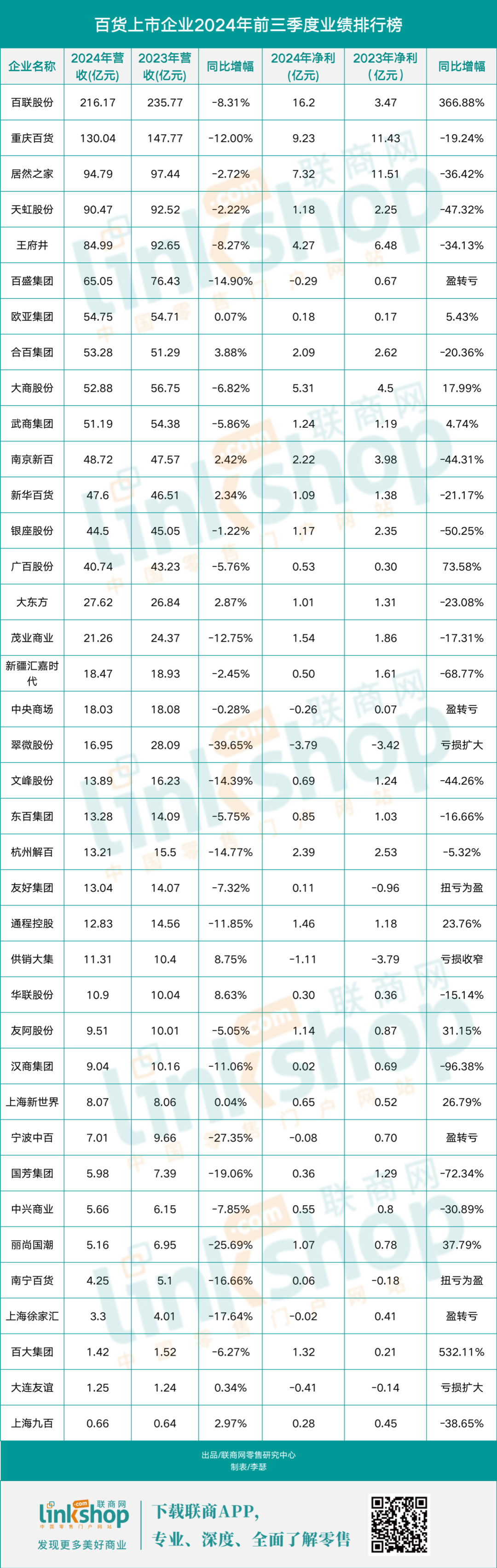 而從前三季度看,38家百貨上市公司實(shí)現(xiàn)營業(yè)收入1327.27億元,比2023年同期的1424.16億元減少96.89億元。實(shí)現(xiàn)凈利潤60.37億元,比2023年同期的61.72億元減少1.35億元。