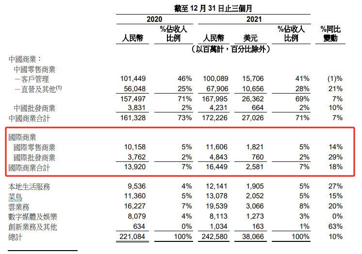 對(duì)比2021年底第四季度,當(dāng)時(shí)對(duì)應(yīng)的阿里國(guó)際商業(yè)板塊營(yíng)收為164.5億元。
