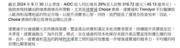 阿里最新的財(cái)報(bào)就提到,阿里國(guó)際強(qiáng)勁的表現(xiàn)由跨境業(yè)務(wù)增長(zhǎng)帶動(dòng),尤其是速賣通Choice業(yè)務(wù),“速賣通和菜鳥跨境物流的協(xié)同效應(yīng)進(jìn)一步增加了速賣通的競(jìng)爭(zhēng)力,平均履約時(shí)長(zhǎng)環(huán)比顯著縮短!