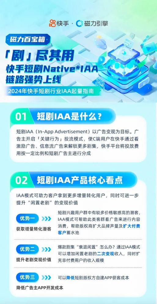 另一方面,今年三季度,快手跑通了In-Apps Ads(IAA,應(yīng)用內(nèi)廣告短劇模式),它在7月份上線了以廣告變現(xiàn)為目標(biāo)的Native*IAA鏈路,擴(kuò)大了免費(fèi)短劇內(nèi)容的消費(fèi)用戶規(guī)模,也拓寬了廣告主的營(yíng)銷場(chǎng)景和變現(xiàn)路徑。