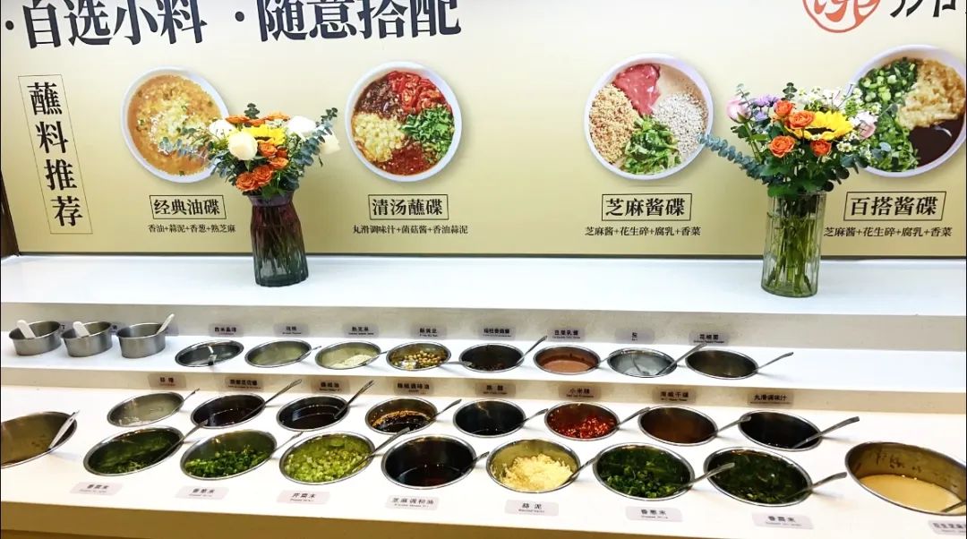 其中調(diào)料臺提供了28種小料,不收費,由顧客自選、自助調(diào)料,店內(nèi)專門貼出了經(jīng)典油碟、清湯蘸碟、芝麻醬碟和百搭醬碟4種吃法。