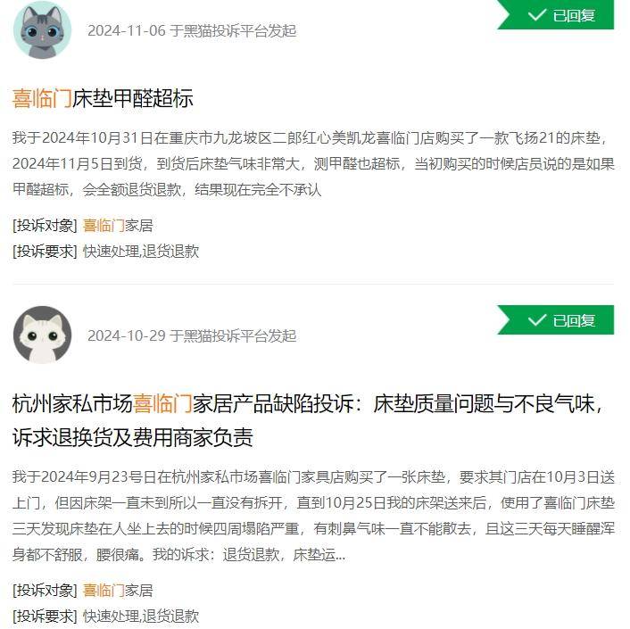智能化功能更像是錦上添花,保證產(chǎn)品質(zhì)量和服務(wù)才是核心。在“黑貓投訴平臺(tái)”上,包含搜索詞“喜臨門”的相關(guān)投訴有超過1600條,其中有不少消費(fèi)者質(zhì)疑喜臨門床墊存在甲醛超標(biāo)、異味、塌陷等質(zhì)量問題以及虛假宣傳、售后服務(wù)等問題。