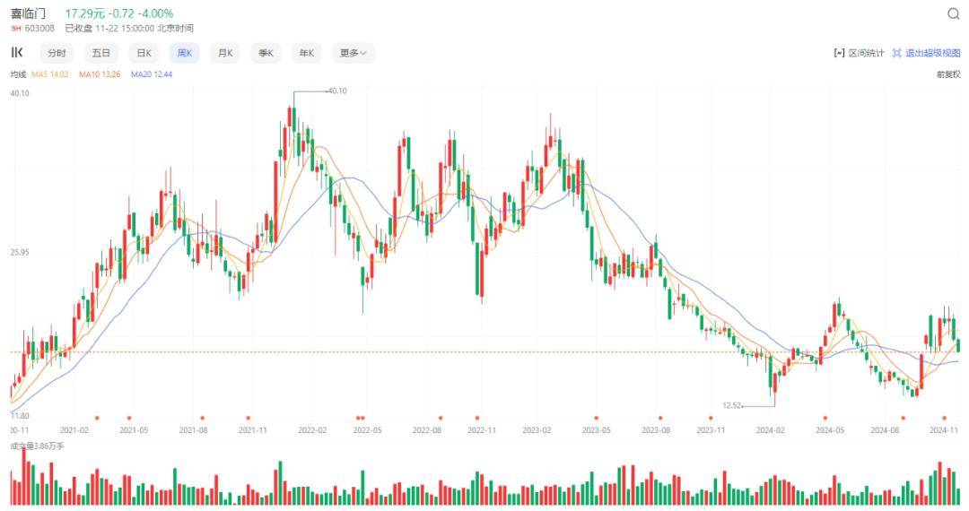 股價(jià)表現(xiàn)上,截至11月22日收盤,喜臨門(603008.SH)報(bào)收17.29元/股,總市值65.53億元;較2022年1月盤中最高40.1元/股的高點(diǎn)相比,喜臨門的股價(jià)兩年多時(shí)間遭遇“腰斬”,總市值蒸發(fā)超80億元。
