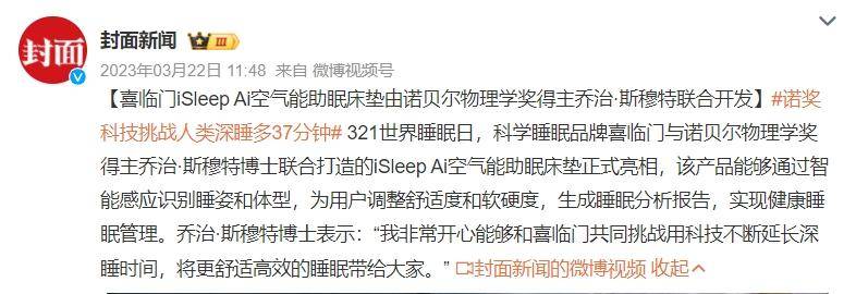 2023年,喜臨門又與手諾貝爾物理學(xué)獎(jiǎng)得主喬治·斯穆特(George F. Smoot)博士合作開發(fā)iSleep Ai空氣能助眠床墊,號(hào)稱將“挑戰(zhàn)人類延長(zhǎng)深睡 37 分鐘”。