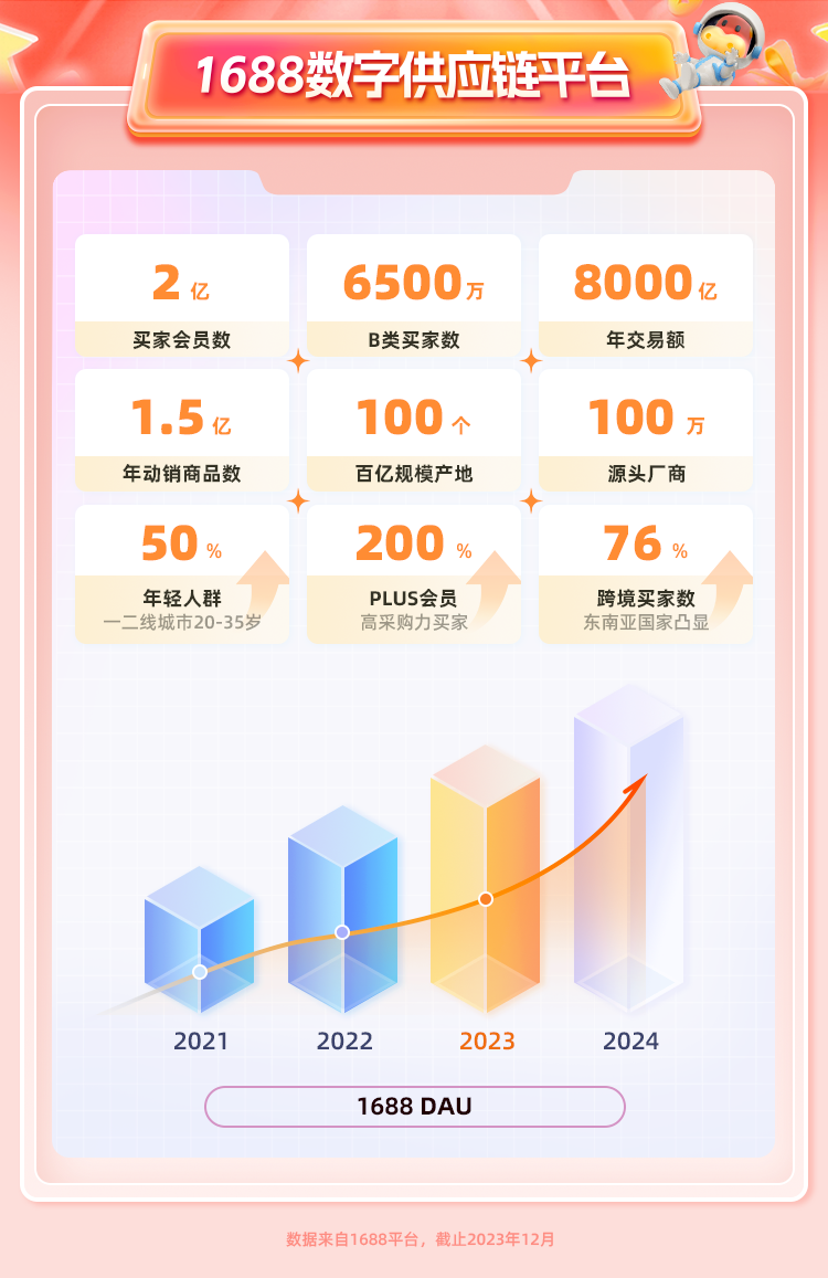 這為1688帶來了一波新的增量。2023年,憑借著在B端業(yè)務(wù)、跨境業(yè)務(wù)和C端消費(fèi)者賽道的多方發(fā)力,1688平臺(tái)的年交易額一舉超過8000億元。