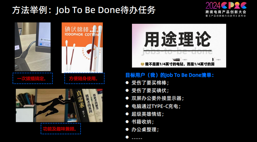 按照待辦任務(wù)理論,我有一堆需求:受傷了要買棉棒,要買碘伏;雙屏辦公需要外接顯示器,電腦需要通過(guò)type-C充電,辦公桌面需要整理……如果我選擇個(gè)人的兩種需求,把它整合到一個(gè)產(chǎn)品中去,這是一種產(chǎn)品創(chuàng)新的方法(但是不代表一定是個(gè)成功的產(chǎn)品,還要滿足“總效用更優(yōu)”)。