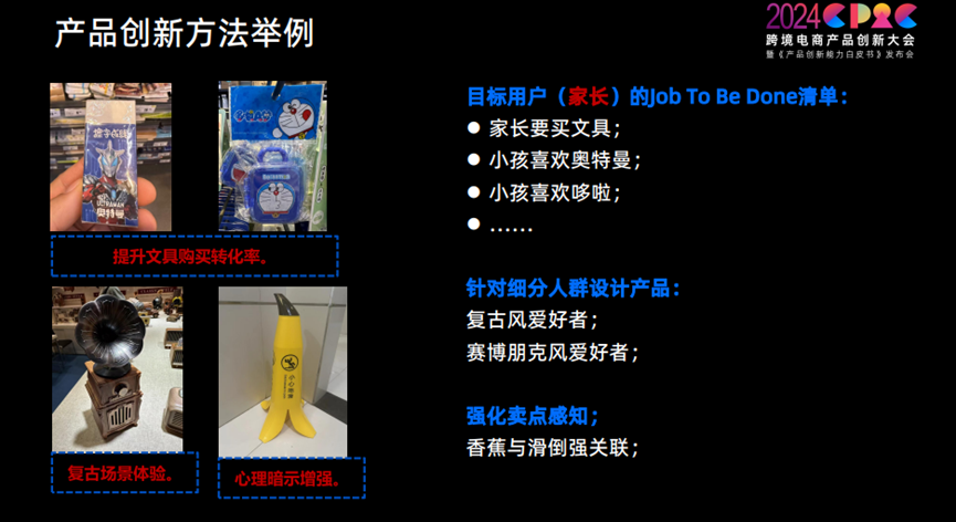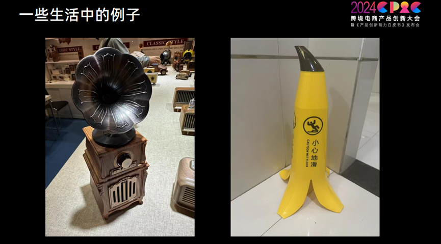 總結(jié)一下,卡通元素的文具,可以提升文具購(gòu)買的轉(zhuǎn)化率,復(fù)古設(shè)計(jì)的藍(lán)牙音箱可以提供家居的復(fù)古體驗(yàn),香蕉狀的防滑警示牌可以給我們?cè)黾有睦戆凳,這是組合創(chuàng)新之一;碘伏棉棒方便攜帶,這是組合創(chuàng)新之二。