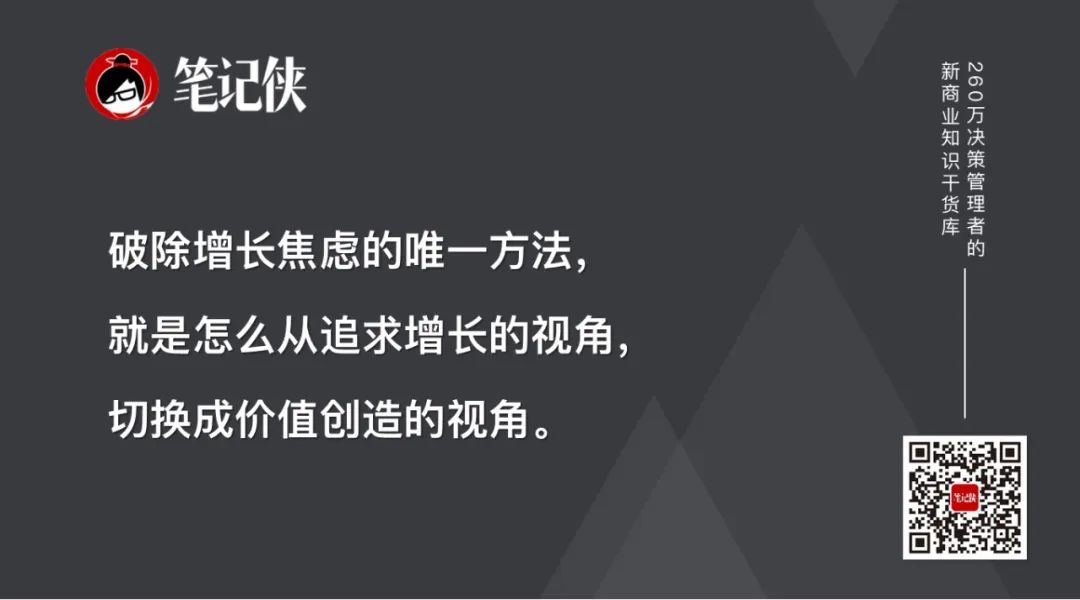 李靖(李叫獸)在《越想增長(zhǎng),越難增長(zhǎng)》一文中總結(jié):破除增長(zhǎng)焦慮的唯一方法,就是怎么從追求增長(zhǎng)的視角,切換成價(jià)值創(chuàng)造的視角。