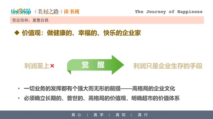 原來,我們是“利潤至上”,覺醒以后,我們覺得利潤只是企業(yè)生存的手段,而作為企業(yè),一切業(yè)務(wù)的發(fā)揮都有個強大而無形的前提——高格局的企業(yè)文化,必須確立長期的、普世的、高格局的價值觀,明確超市的價值體系。