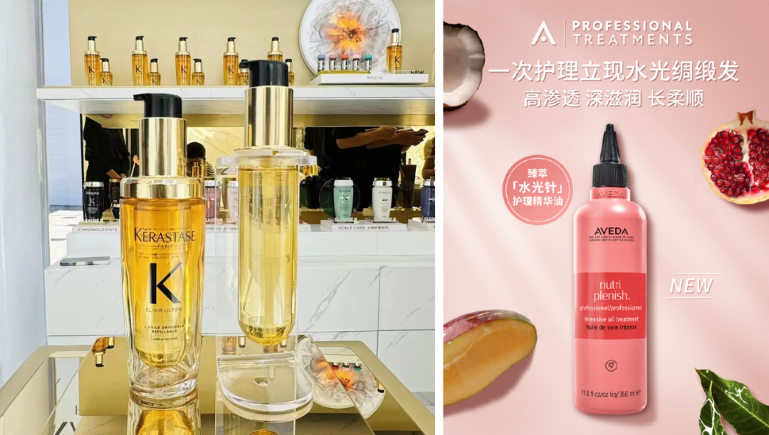 另外可以發(fā)現(xiàn),Loreal Pro、Aveda、馥綠德雅、歐舒丹等一系列高端洗護(hù)發(fā)品牌的推新動(dòng)作集中于“進(jìn)階養(yǎng)護(hù)”領(lǐng)域,比如Loreal Pro“第二代瞬順精油”、Aveda“臻萃水光針護(hù)理精華油”、馥綠德雅“小綠噴頭皮精華”、“水療奢護(hù)系列”、歐舒丹“生機(jī)瓶”等產(chǎn)品均為精華、精油類,在洗發(fā)水、護(hù)發(fā)素之上的精油養(yǎng)護(hù)賽道加速競(jìng)爭(zhēng)。