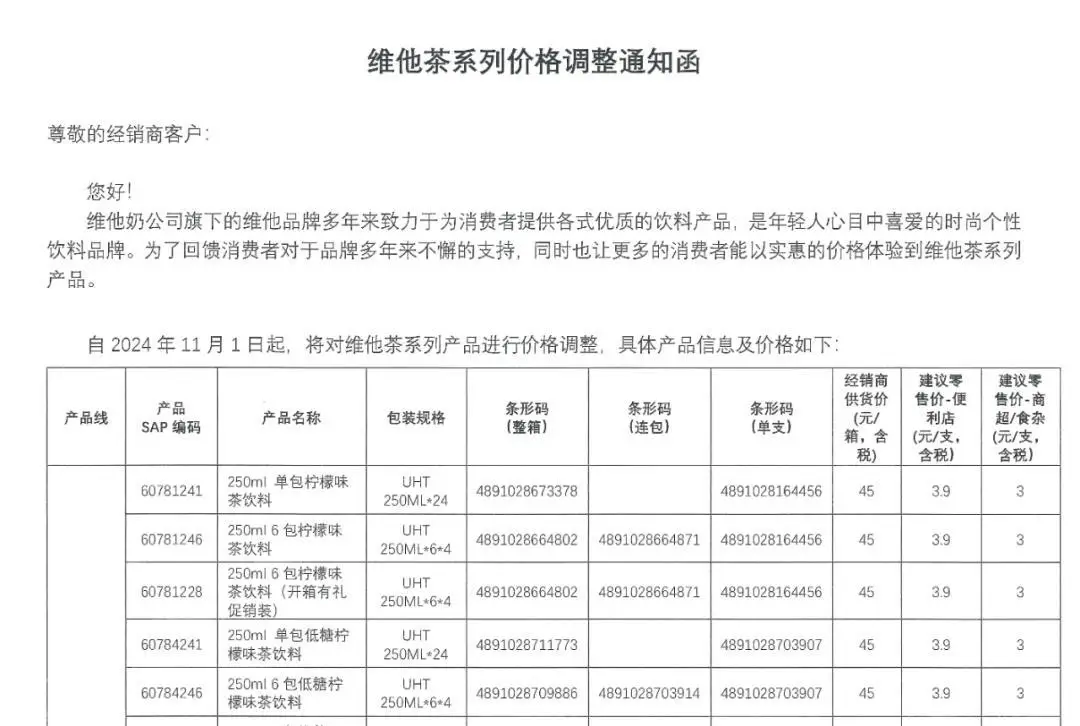 根據(jù)維他奶發(fā)布的《維他茶系列價(jià)格調(diào)整通知函》,此次降價(jià)旨在回饋消費(fèi)者多年來(lái)對(duì)品牌的支持,同時(shí)也希望讓更多的消費(fèi)者能以實(shí)惠的價(jià)格體驗(yàn)到維他茶系列產(chǎn)品。具體來(lái)說(shuō),維他奶250ml單包茶、500ml PET、310ml禮盒裝3種規(guī)格的多款茶飲料經(jīng)銷(xiāo)商供貨價(jià)均有所下調(diào),下調(diào)幅度約為每件2元。