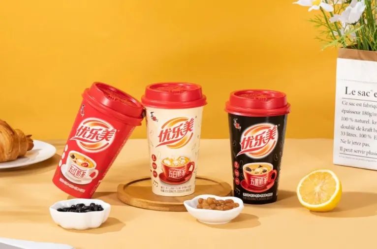 從2023年起,優(yōu)樂美產(chǎn)品的中式風(fēng)格和功能性愈發(fā)明顯。選用紅米、紅豆、紅棗、黑芝麻等食材,制成谷物系列奶茶,強調(diào)“內(nèi)含高膳食纖維、礦物質(zhì)和鈣質(zhì)”。或者用枸杞、紅棗、山藥、百合等食材,制成中式風(fēng)味系列奶茶,強調(diào)中式食養(yǎng)文化。此外,它還推出過玫瑰布丁膠原蛋白肽奶茶,以及宣稱鈣和蛋白含量為牛奶8倍的新式奶茶。