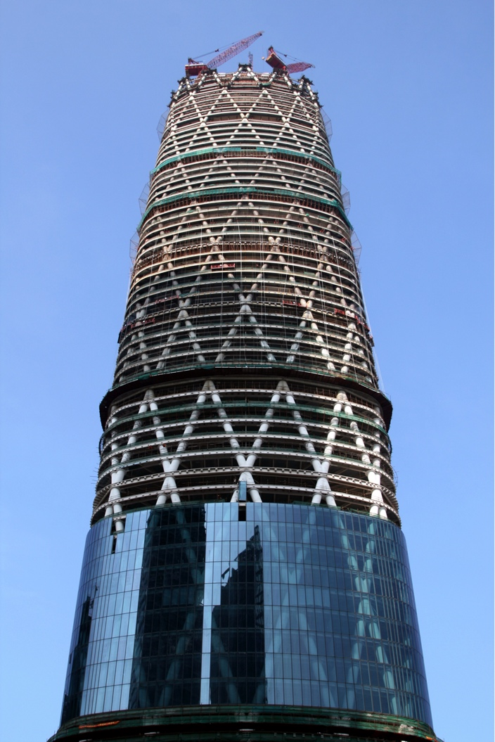 以巨型鋼管混凝土結(jié)構(gòu)和筒中筒結(jié)構(gòu)保證安全性,以獨(dú)特的巨型斜交網(wǎng)格結(jié)構(gòu)和圓弧三角形結(jié)構(gòu)來抵御最高15級(jí)臺(tái)風(fēng),保證抗風(fēng)性。