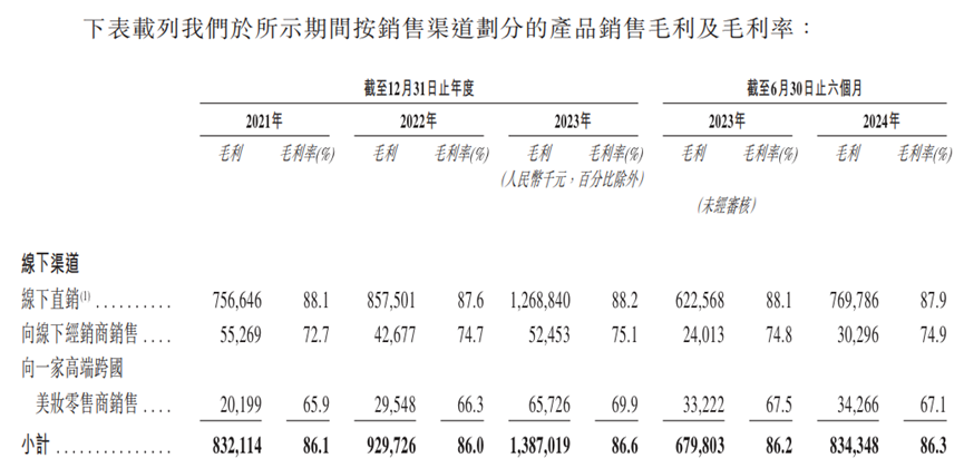 毛戈平的毛利率之所以如此高,主要是因?yàn)槠渚劢咕下直銷渠道。招股書顯示,2021年-2023年,毛戈平的線下直銷渠道營(yíng)收占比分別為57.5%、55.1%以及51.7%,占比均過(guò)半;毛利率分別為88.1%、87.6%、88.2%,比同期經(jīng)銷和線上直銷的毛利率都高。