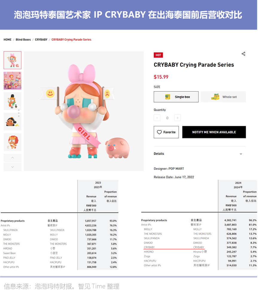 泡泡瑪特在泰國(guó)簽約的本土藝術(shù)家 Molly 曾被評(píng)為 2023 泰國(guó) 50 位最具影響力女性。她設(shè)計(jì)的 CRYBABY 在泡泡瑪特布局泰國(guó)前僅能合并在報(bào)表中的「其他藝術(shù)家 IP」 計(jì)算收入,而在進(jìn)入泰國(guó)后,CRYBABY 在今年上半年就為泡泡瑪特帶來(lái)了超三億元人民幣的收入。