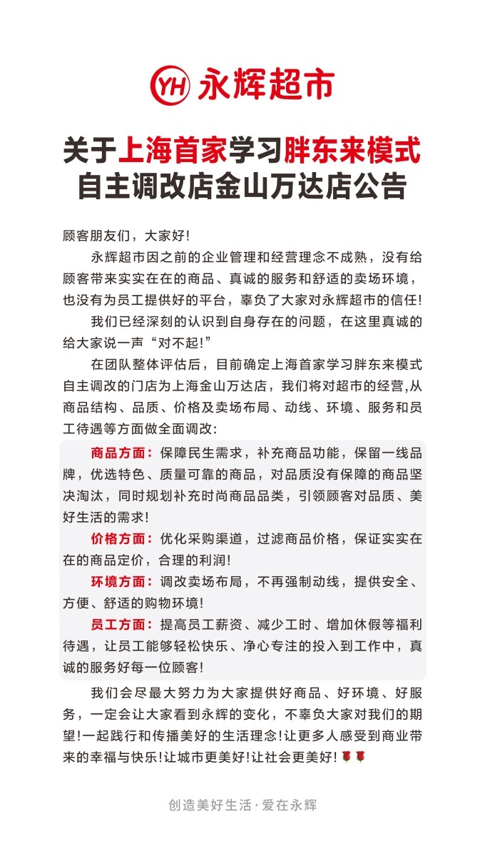 11月28日,永輝發(fā)布消息稱,目前確定上海首家學習胖東來模式自主調改的門店為上海金山萬達店。