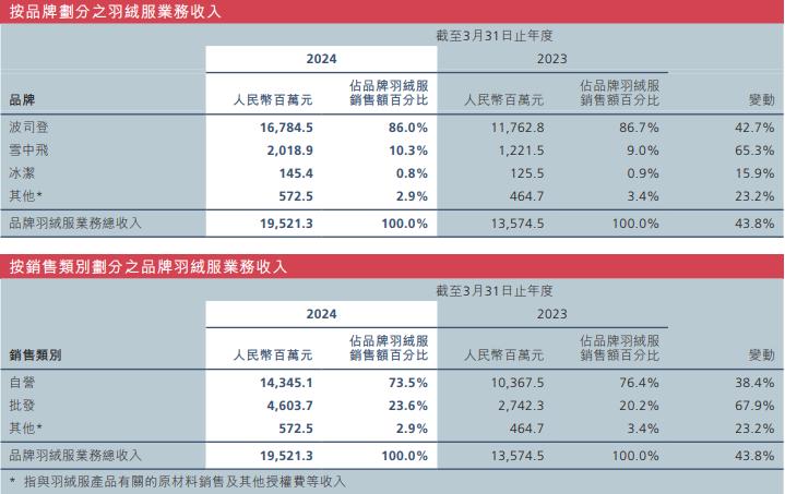彼時,雪中飛的收入在波司登品牌羽絨服業(yè)務(wù)收入中的占比并不高。財報顯示,2023年3月31日到9月30日,品牌雪中飛實現(xiàn)收入2.65億元,在品牌羽絨服銷售額中占比5.4%。而波司登2024財年年報顯示,雪中飛實現(xiàn)收入20.19億元,同比增長65.3%,占比則提升到了10.3%。這背后,除了季節(jié)的因素,或許也與波司登加大布局普惠羽絨服賽道有關(guān)。