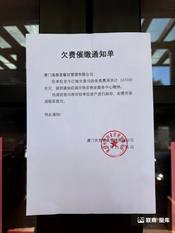 其中“欠費催繳通知單”的落款是廈門外貿(mào)物業(yè)管理有限公司,上面寫著“廈門海鼎薈餐飲管理有限公司拖欠業(yè)主方各類費用共計14.7萬元,接到通知后盡快至物業(yè)服務(wù)中心繳納!