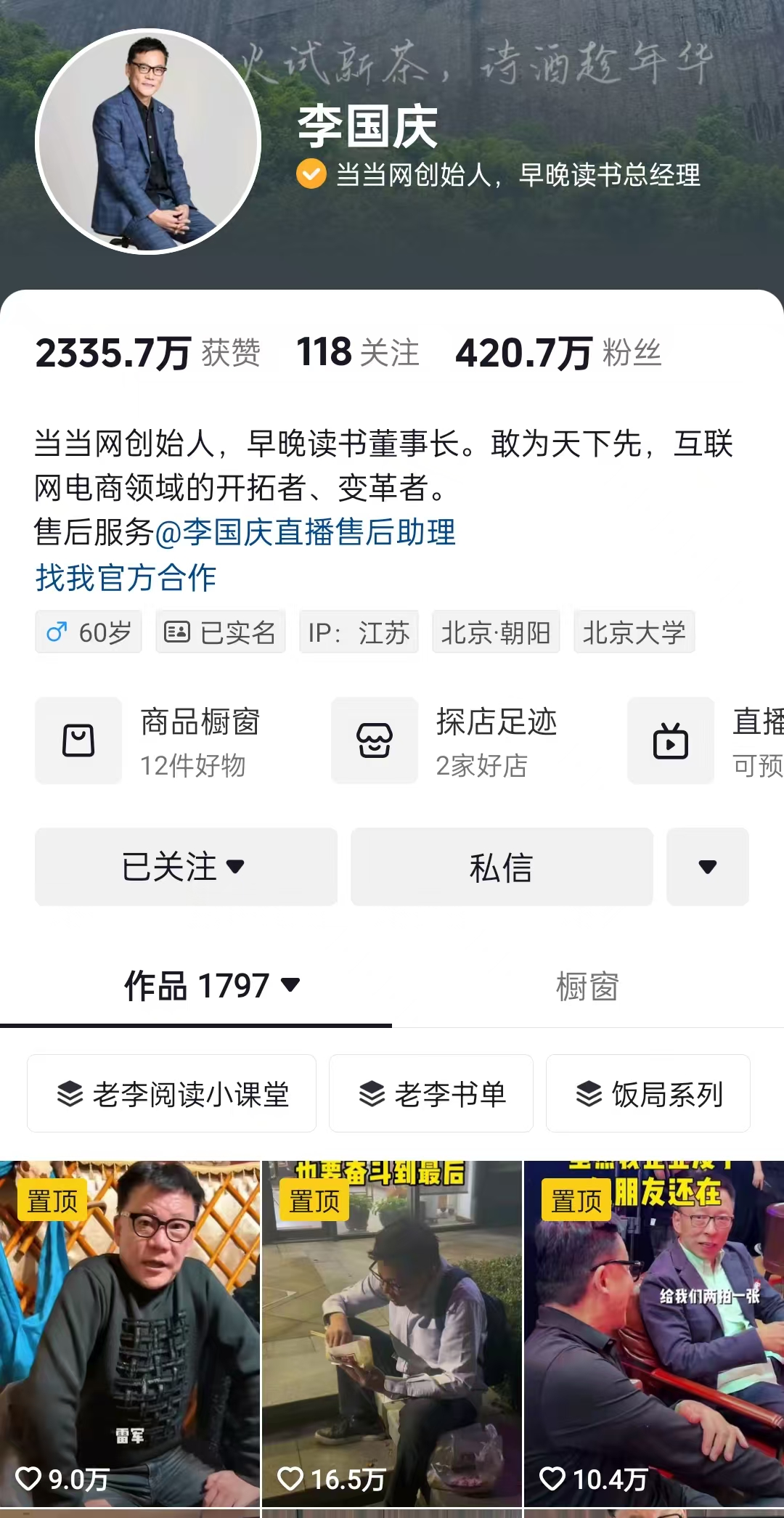 在抖音平臺(tái),目前李國慶抖音粉絲數(shù)為420.7萬。