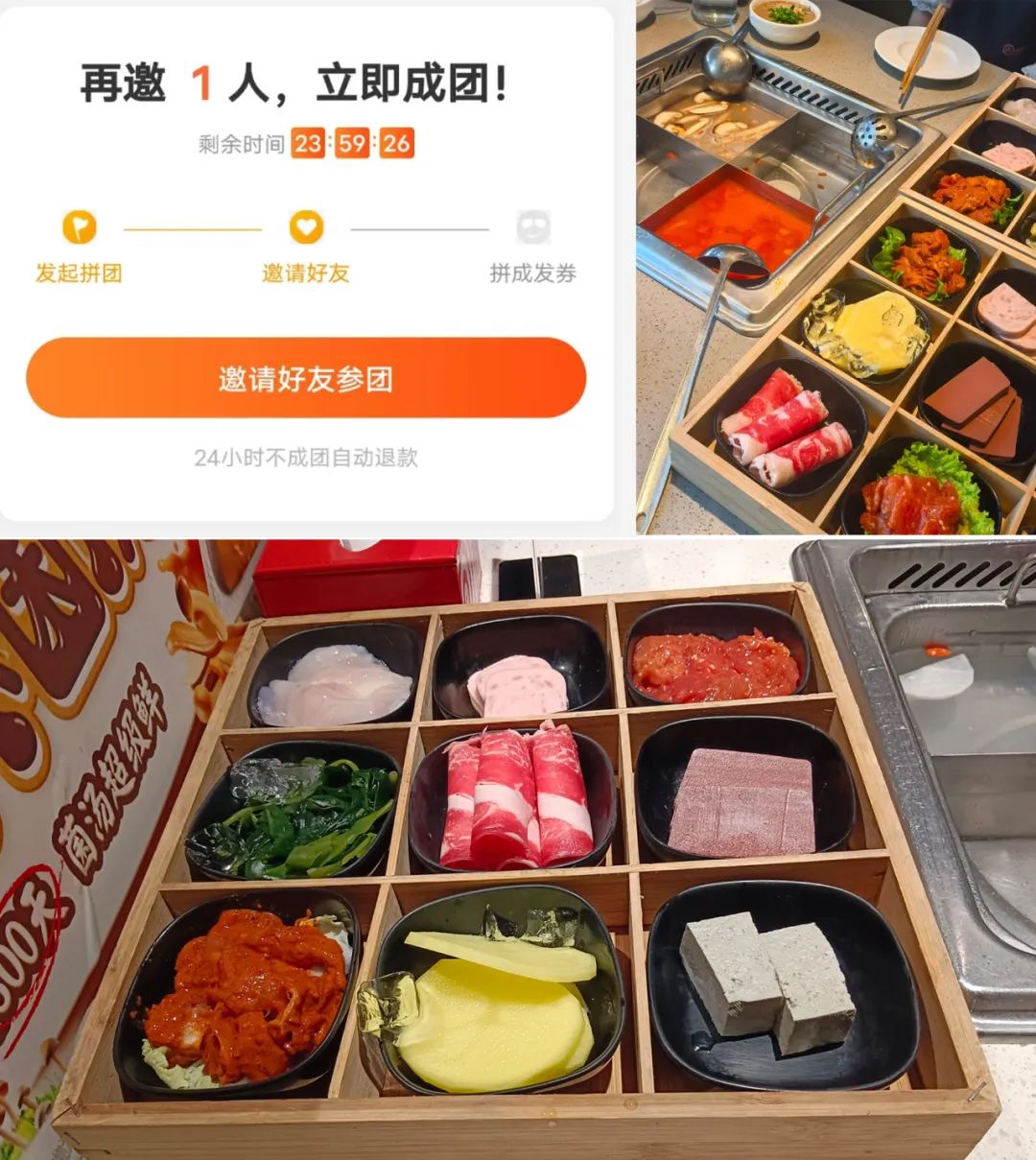 套餐內(nèi)含一份鍋底、一份小料、一份米飯/撈面、一碟水果、一份檸檬水,以及一份九宮格菜品。在價(jià)格上,套餐共有兩種,兩人拼團(tuán)成功后可享優(yōu)惠,券后59元套餐是五葷四素,69元是六葷三素。