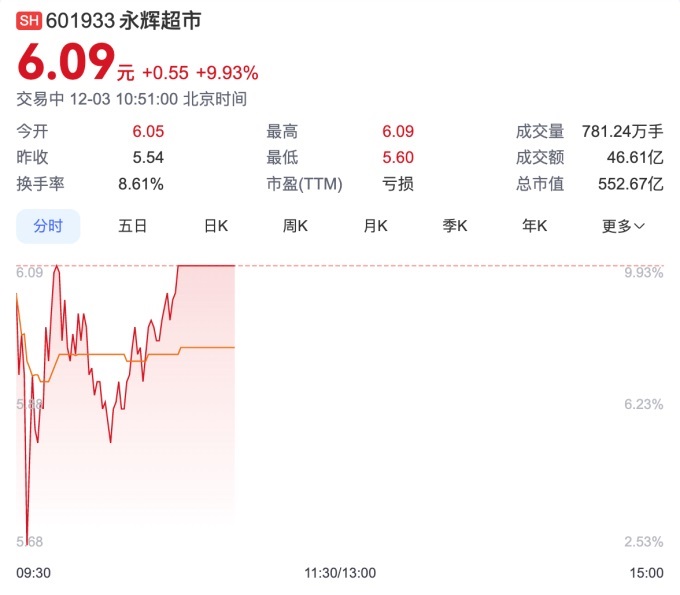 聯(lián)商快訊:12月3日消息,永輝超市盤中再度漲停,股價為6.09元,漲幅近10%,錄得3連板,股價創(chuàng)逾3年半新高。