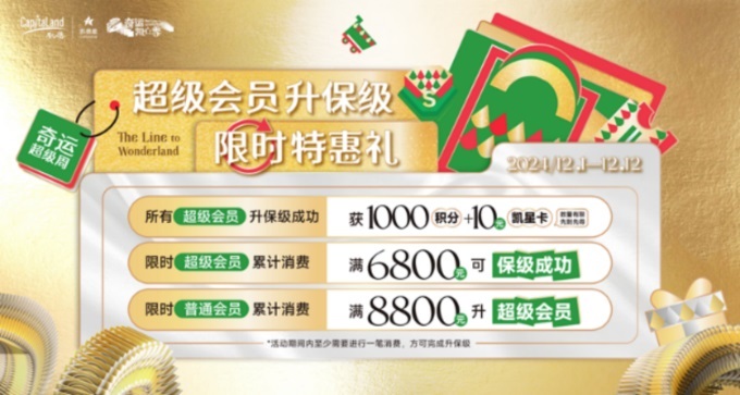 2024年12月1日至12日,所有超級會員升級或保級成功,可獲得1,000積分及10元凱星卡獎勵。另外,助力更多會員享受豐富權(quán)益及禮遇,超級會員升保級條件將進行限時調(diào)整——超級會員保級從累計消費滿8,000元調(diào)整至6,800元,普通會員升級到超級會員從累計消費滿10,000元調(diào)整為8,800元。