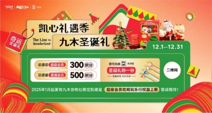 此次活動凱德星聯(lián)合文創(chuàng)雜貨集合店品牌【九木雜物社】為會員獻上獨家驚喜,12月期間,超級會員憑300積分、普通會員憑500積分即可兌換九木雜物社限定圣誕禮一份;2025年1月起還有更多超級會員專享禮遇,為凱德星會員打造創(chuàng)意品質(zhì)生活體驗。