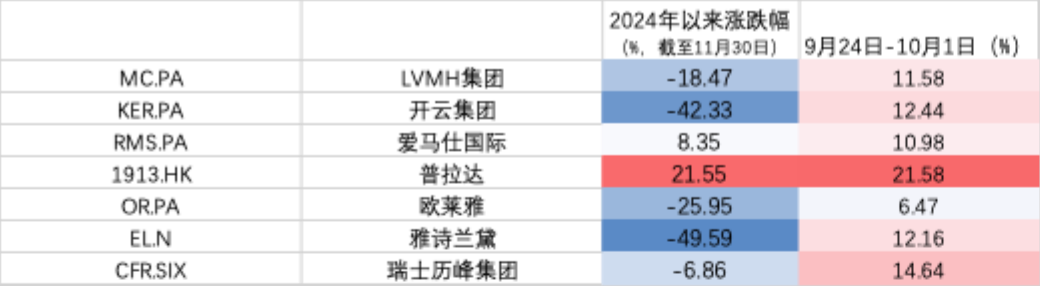 中國市場與奢侈品行業(yè)繁榮的緊密相關(guān),亦折射在資本市場!924」政策出臺后一周內(nèi),中國市場的反彈預(yù)期刺激各大奢侈品集團(tuán)股價明顯上漲(見圖表)。