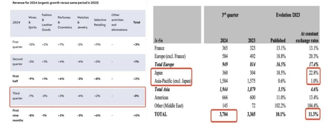 圖表:LVMH集團(tuán)、愛馬仕集團(tuán)2024年第三季度業(yè)績表現(xiàn),數(shù)據(jù)來源:公司官網(wǎng)