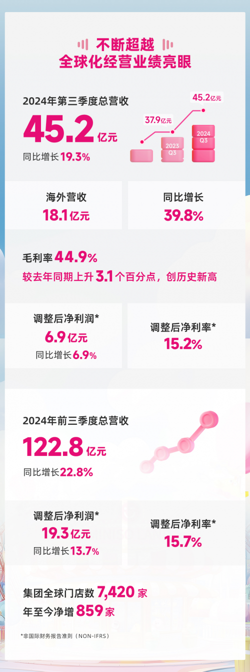 名創(chuàng)優(yōu)品集團(tuán)創(chuàng)始人、董事會主席兼首席執(zhí)行官葉國富在財報電話會上提到,2024年前三季度,名創(chuàng)優(yōu)品海外業(yè)務(wù)收入突破45億,同比增長41%,海外市場IP商品銷售占比超過40%,銷售額同比增長近85%,由此帶動整個海外市場毛利率明顯提升。