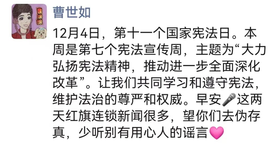 12月4日,曹世如在微信朋友圈稱:“這兩天紅旗連鎖新聞很多,望你們?nèi)未嬲妫俾爠e有用心人的謠言。”并隨后發(fā)布回應(yīng)視頻,稱辭去的是董事長職務(wù),仍擔(dān)任總經(jīng)理職務(wù)。