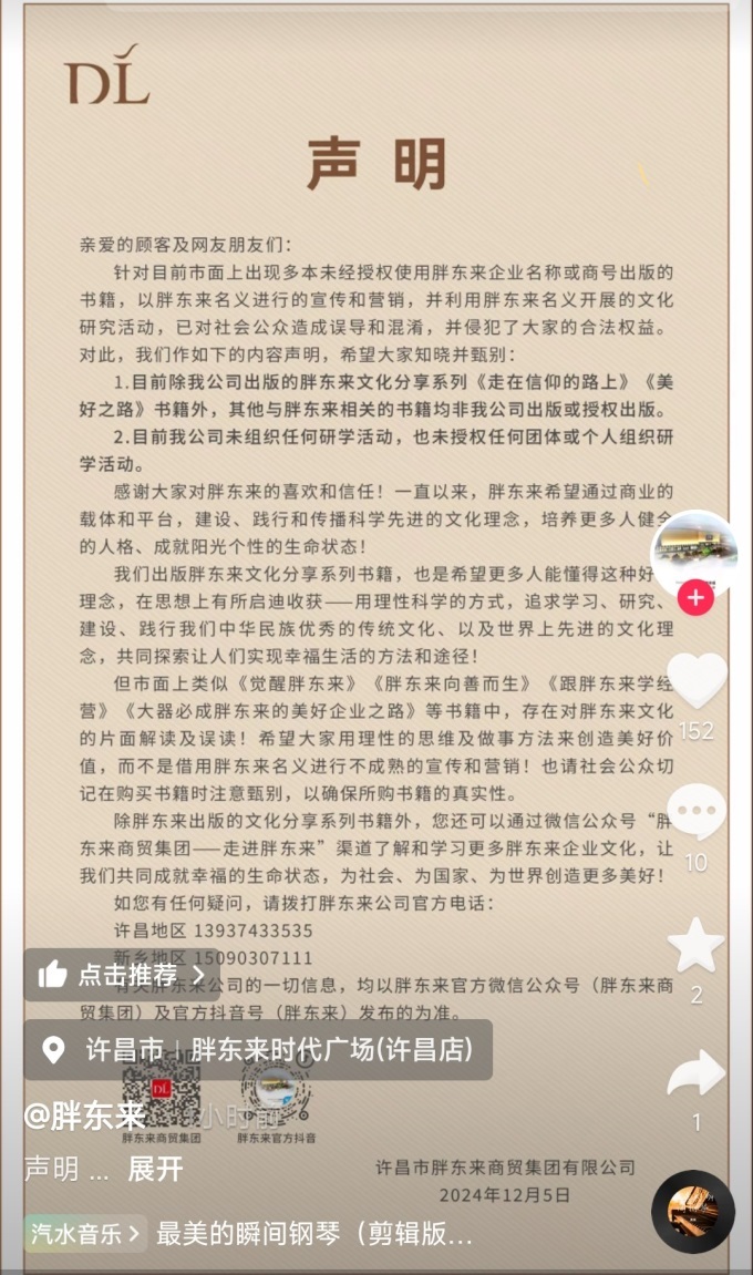 12月5日,胖東來發(fā)布聲明稱,目前市面上出現(xiàn)多本未經(jīng)授權(quán)使用胖東來企業(yè)名稱或商號出版的書籍,以胖東來名義進(jìn)行的宣傳和營銷,并利用胖東來名義開展的文化研究活動,已對社會公眾造成誤導(dǎo)和混淆,并侵犯了大家的合法權(quán)益。