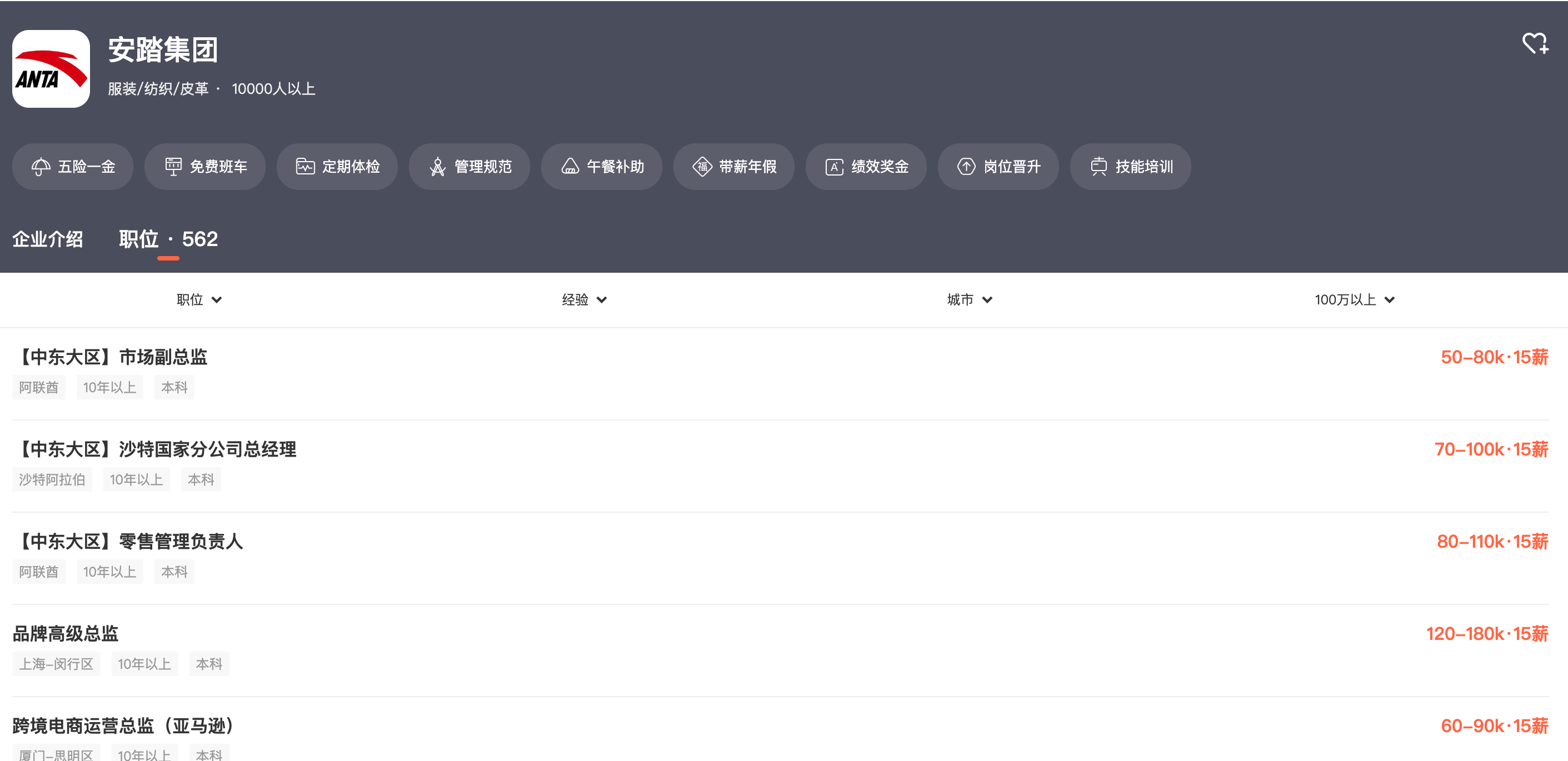 某招聘平臺頁面顯示,安踏集團正招聘多個針對海外市場的崗位,包括海外關(guān)務(wù)經(jīng)理、零售平面創(chuàng)意企劃、具有國際市場經(jīng)驗和認(rèn)知的物流經(jīng)理、跟單經(jīng)理、零售培訓(xùn)、零售陳列執(zhí)行、海外內(nèi)控方向的高級會計師、美國核算會計師等。其中,中東大區(qū)零售管理負(fù)責(zé)人的年薪范圍為120萬元至165萬元。