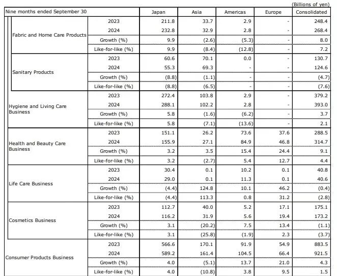 從目前財(cái)務(wù)表現(xiàn)來(lái)看,Tomoko Uchiyama即將接手的花王化妝品業(yè)務(wù),可謂一塊“燙手山芋”。據(jù)花王最新財(cái)報(bào),今年前三季度,該集團(tuán)消費(fèi)品事業(yè)部銷售額同比增長(zhǎng)4.3%,達(dá)到9215億日元(約合人民幣447.31億元)。其中,化妝品業(yè)務(wù)是該部門銷售額唯一錄得業(yè)績(jī)下滑的板塊,也是營(yíng)業(yè)利潤(rùn)唯一錄得負(fù)數(shù)的板塊。