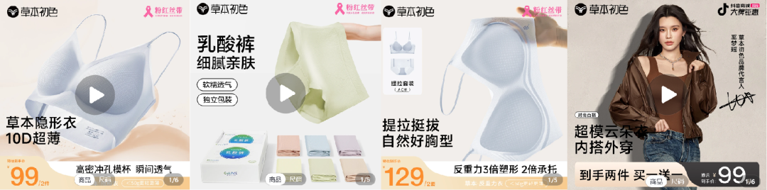 截至今年10月,草本初色在抖音獲得了超14.5億的曝光,投放了超2000條商品鏈接,其中銷售額過(guò)億的就有4款單品,覆蓋了文胸、內(nèi)褲、背心三大細(xì)分品類。