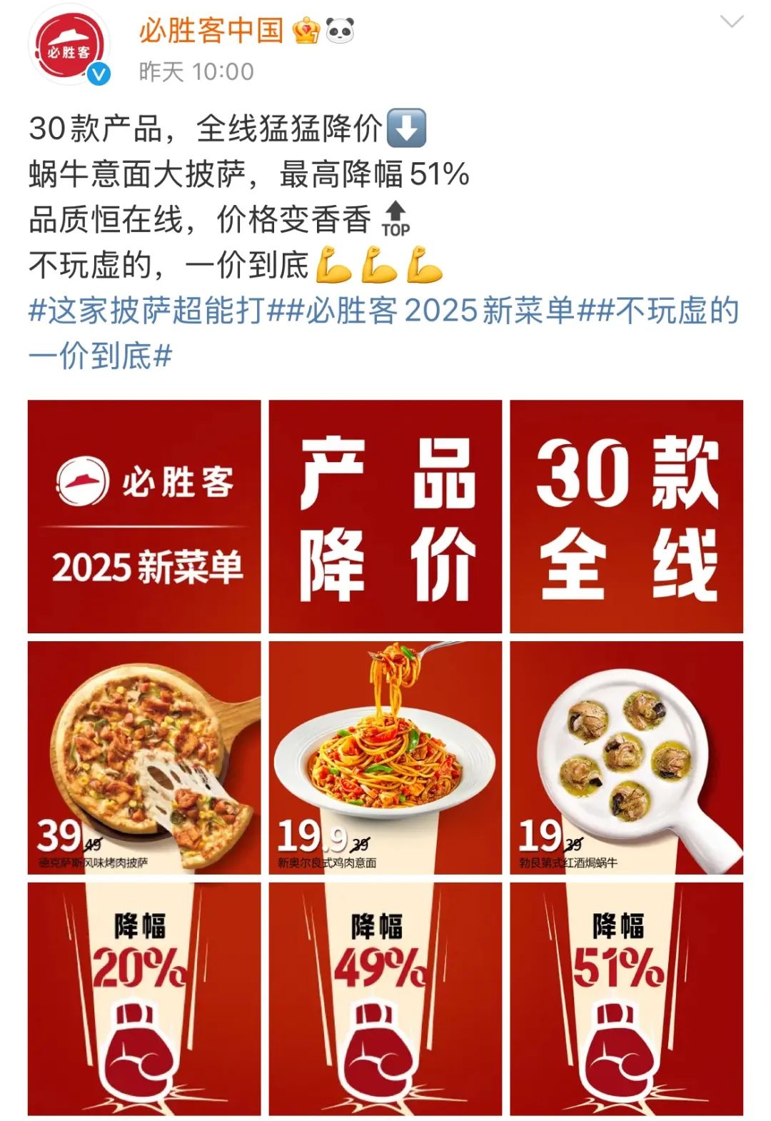 近日,必勝客公布2025年新菜單,并宣布30款產(chǎn)品全線降價(jià)。
